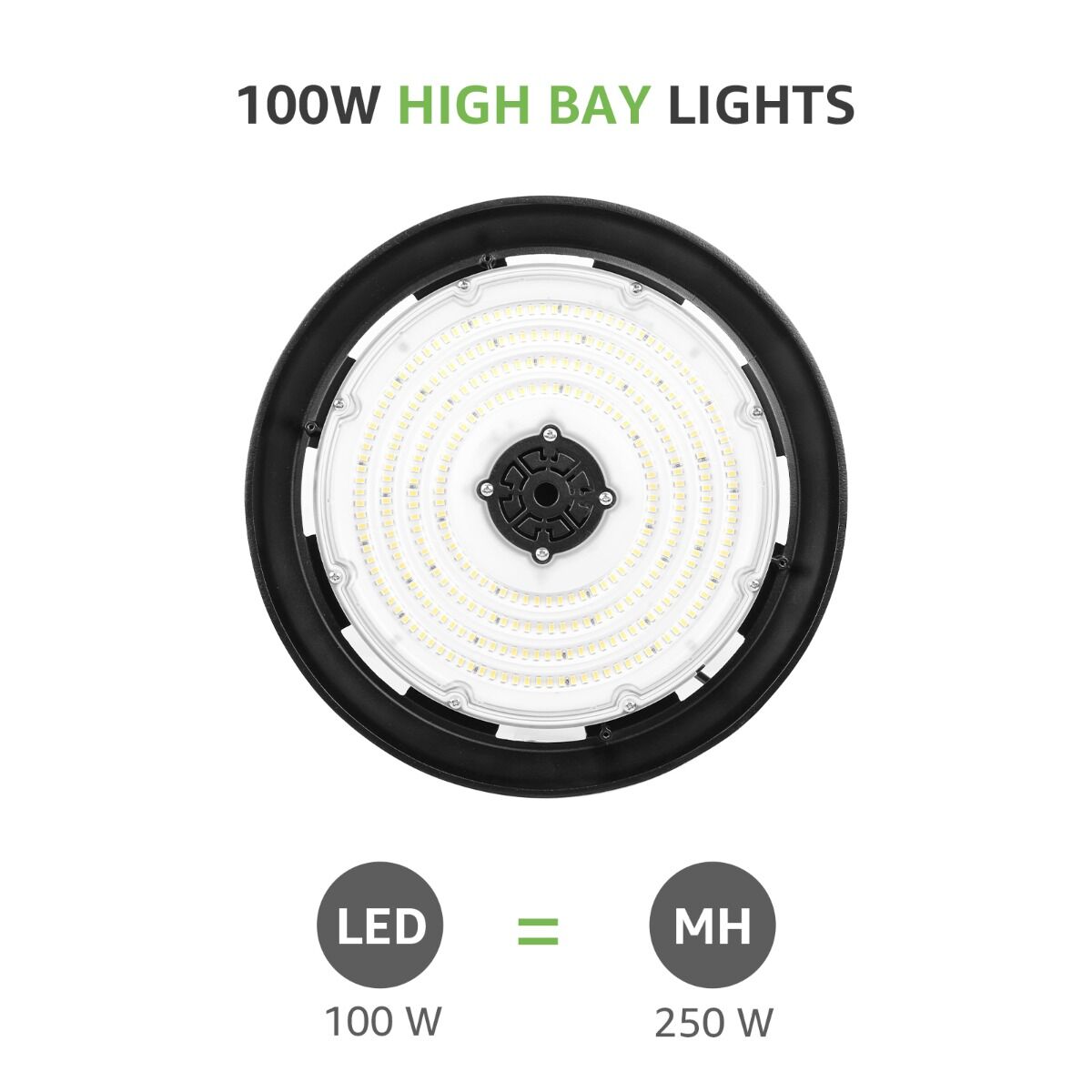 - Our LED modules have a derating usage of 70% and are known for their excellent heat dissipation up to 40 radiating fins. Thus, our 100W LED UFO High Bay Lights can achieve up to 145lm/W. Any traditional 250W metal-halide UFO light can therefore be easily replaced with Lepro’s 100W UFO High Bay Light, making our lights friendly for every home.