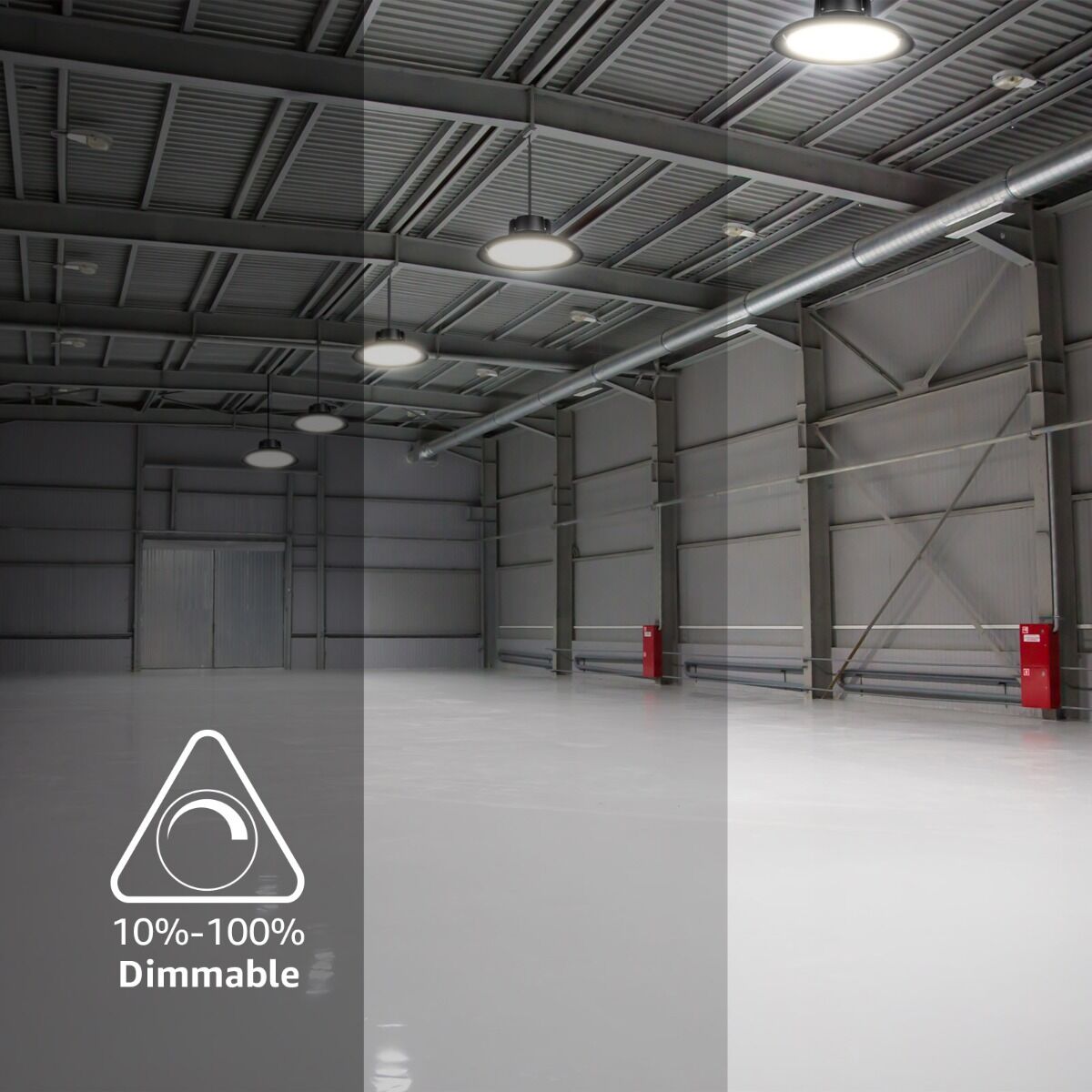 Exceptional Brightness and Energy Savings: The Lepro 100W UFO high bay light delivers a powerful 14,500 lumens, equivalent to a 250W metal halide lamp, with a remarkable efficiency of 145lm/W. Enhance your space's illumination while significantly reducing electricity consumption by up to 60% with an optional 0-10V dimmer for adjustable brightness.