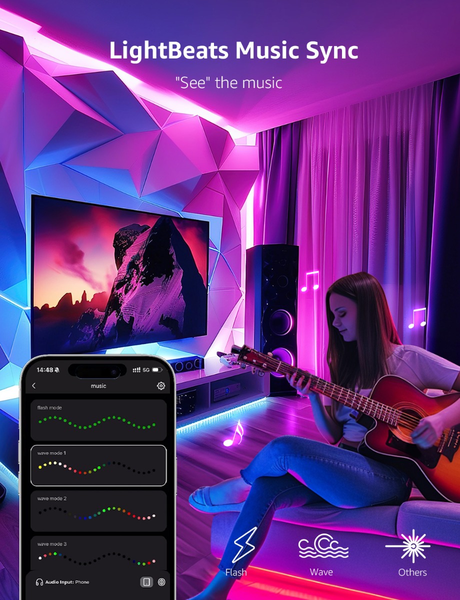 LightBeats Music Sync: Experience music like never before. With AI algorithms, the dynamic lighting of the S1 color changing strip light can intelligently sync seamlessly with the music rhythms. You can choose to recognize music either through the controller or the Lepro+ App, transforming any space into an energetic and mesmerizing musical journey. We're on a quest to make you "see" the music.