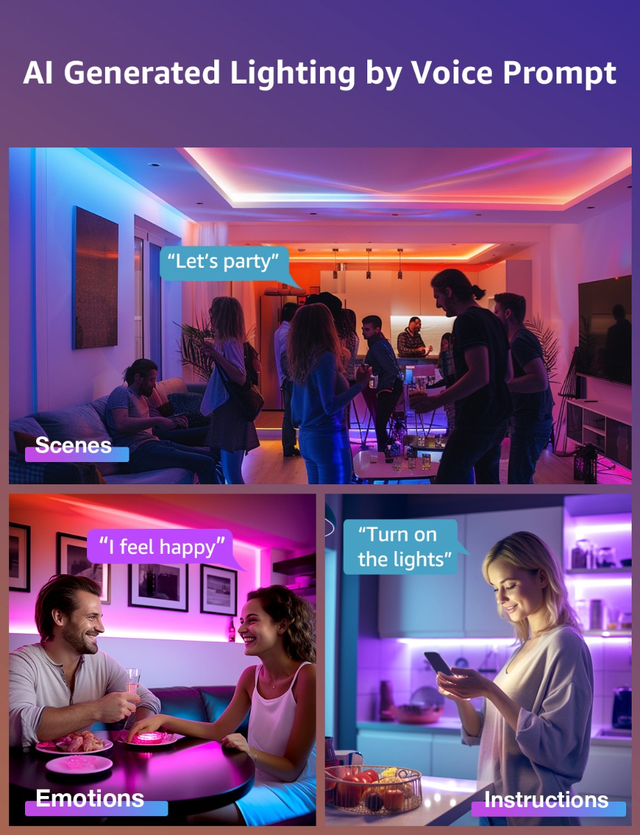 AI Generated Lighting by Voice Prompt: AI understands your voice prompt. Whether requiring AI to generate a lighting effect that matches your mood or scene needs, or it's a simple adjustment of brightness, turning the lights on or off, all can be accomplished in seconds. Also compatible with Alexa or Google Assistant. Enjoy seamless convenience and create delightful moments with ease.