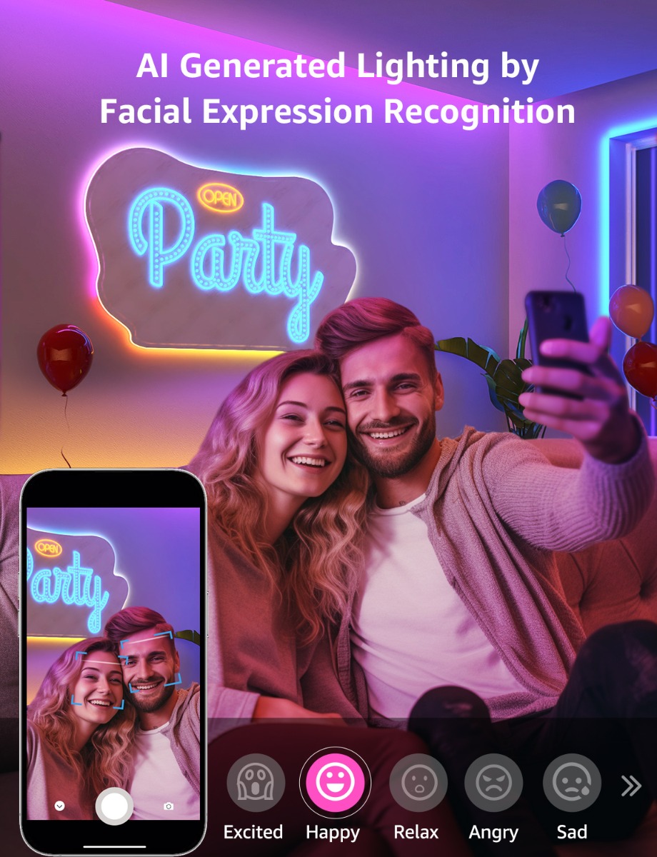 AI Generated Lighting by Facial Expression Recognition: AI recognizes your emotions from a selfie and generates lighting effects tailored to your mood, offering a home lighting solution that truly elevates your home lighting experience. Snap a selfie, upload it on the Lepro+ app, or simply say your mood to enjoy lighting that reflects how you feel. Experience personalized lighting that matches your mood effortlessly.