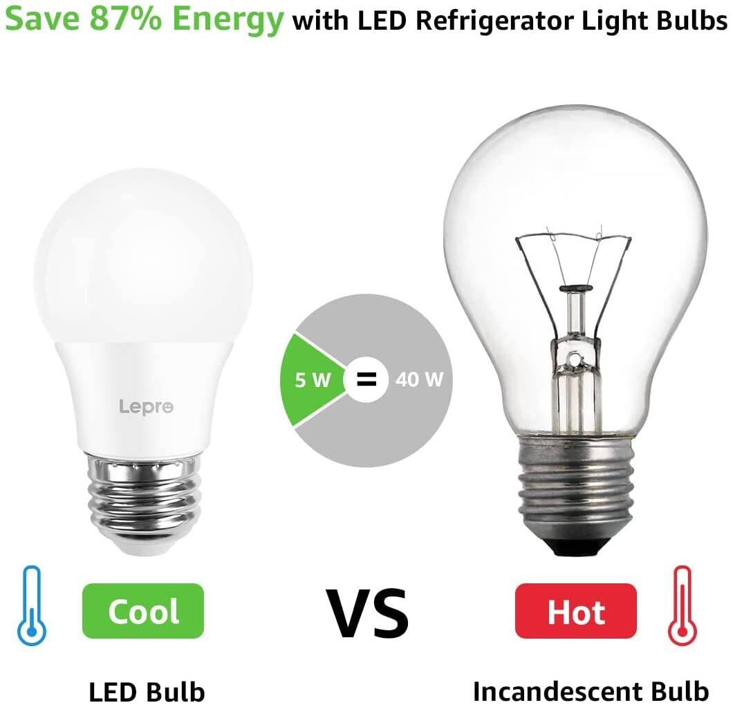 Lepro Refrigerator Light Bulb, LED Fridge Bulb, 40W Equivalent, Waterproof Freezer Bulbs, 120V 5W 450 Lumens Non-Dimmable, 5000K Daylight White, A15 E26 Medium Base, 2 Packs
