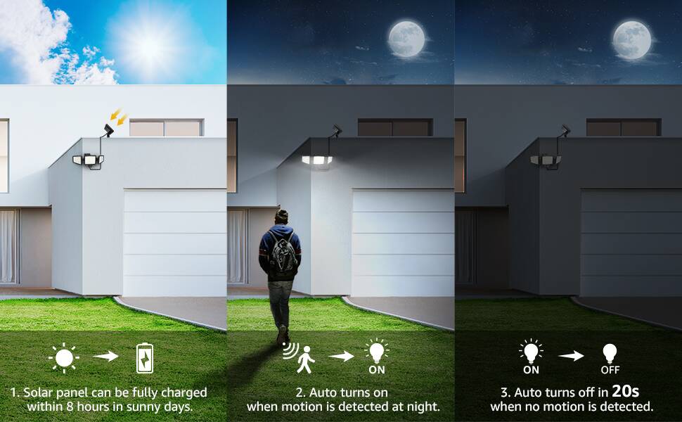 Motion Sensor: The Lepro solar light's PIR sensor, with a 120° detection angle, efficiently detects human movement within a range of 16-26 feet. This feature ensures that the light automatically turns on at night when motion is sensed, and turns off 20 seconds after the movement ceases, enhancing security and energy efficiency.
