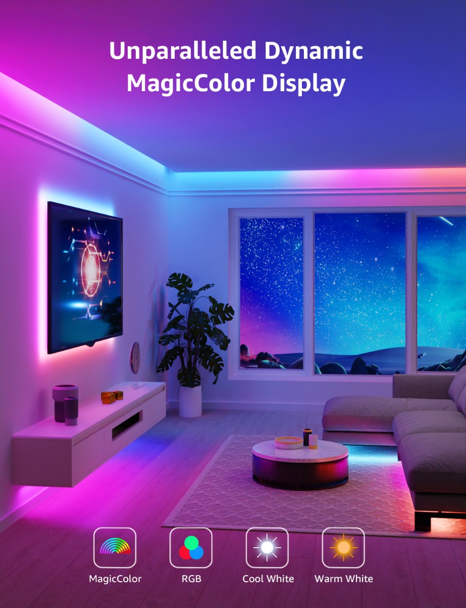 Unparalleled Dynamic RGB Color Display: Compared to traditional RGB light strips, the newest Lepro S1 smart light strips are embedded with integrated circuits (50 IC within 32.8ft), you can choose among a variety of dynamic modes to create a beautiful rainbow chase effect. Elevate your senses and immerse yourself in an unparalleled lighting experience.