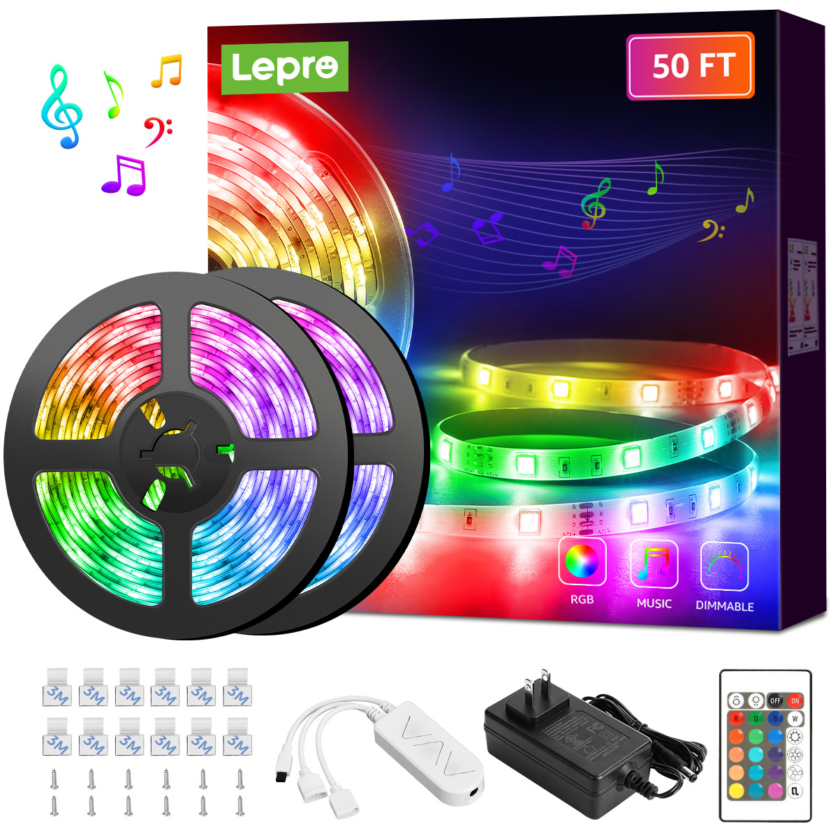 Lepro 49.2ft LED Strip Lights Sync to Music, 5050 SMD RGB Color Changing LED Strips with Remote for Bedroom, Home, TV, Parties and Festivals