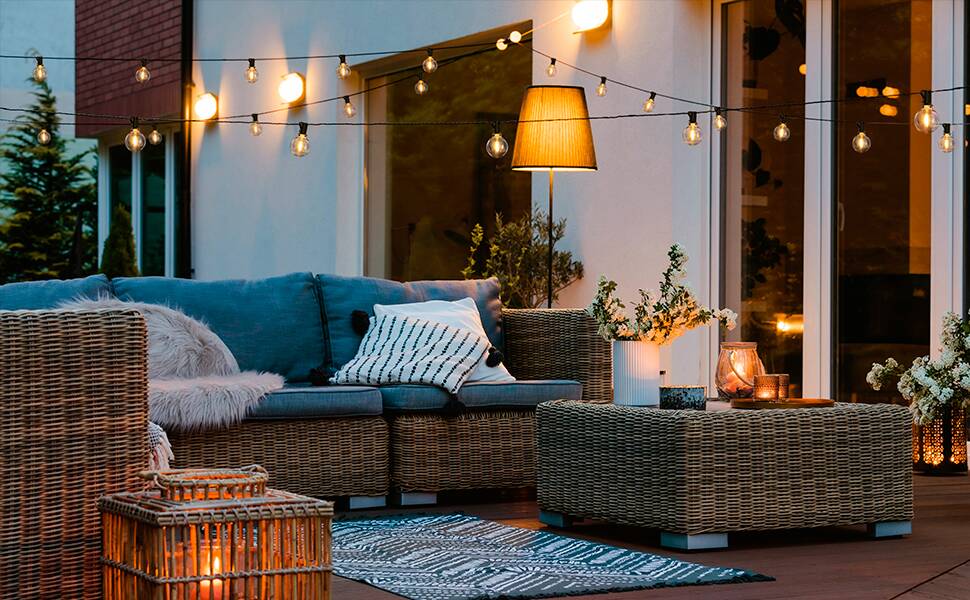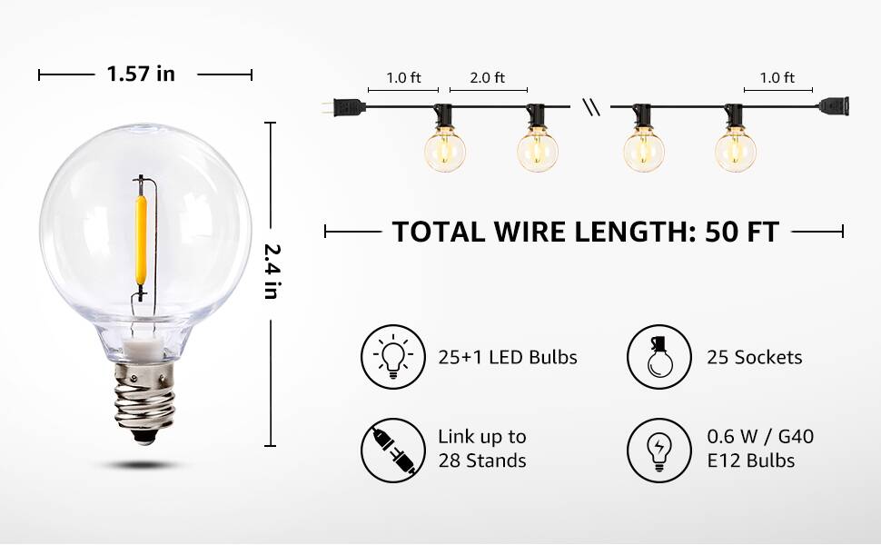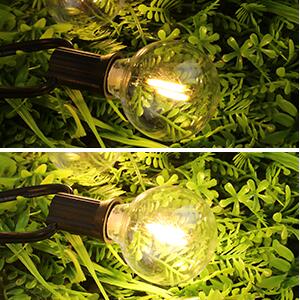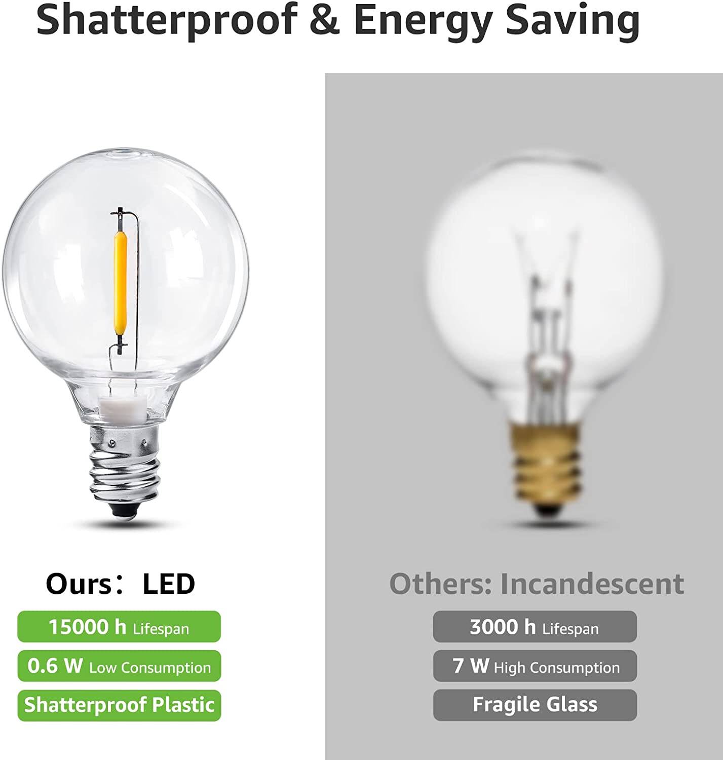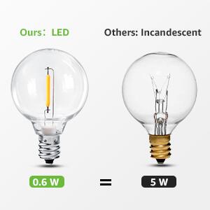 Energy Efficient. This LED patio string lights features low-power LED lights that consume 88% less electricity than typical outdoor light strands with same brightness.