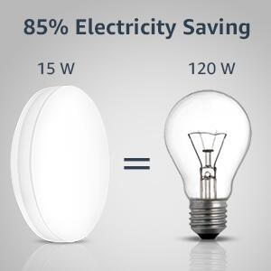 Save 85% on Electricity Bills. The brightness of this 15W led ceiling light is equivalent to 120W traditional ceiling fixtures (with 2x60W incandescent or circle-line fluorescent bulbs).