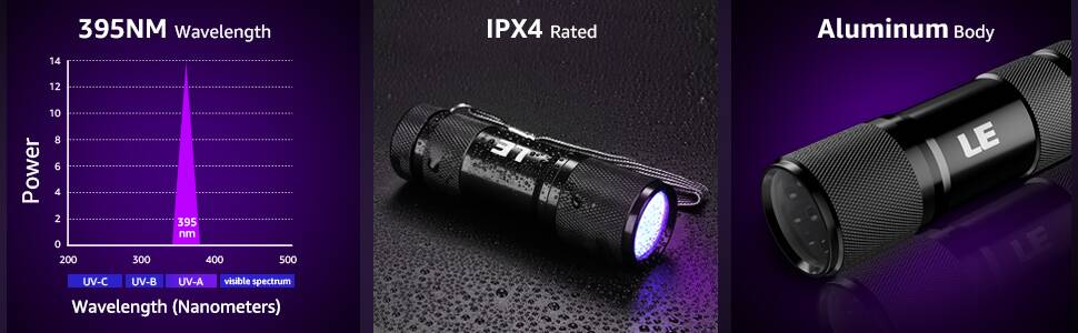Practicle: 395nm wavelength help detect animal urine and food stains on rugs, carpets and clothes that couldn't see with naked eyes.