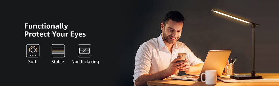 Eye Care Diffused Non-Flickering Lighting. With frosted shade and a long lamp head, it cast a broader span of soft light, efficiently reduce the contrast between your monitor and the surrounding area, creating a more comfortable environment for your eyes.