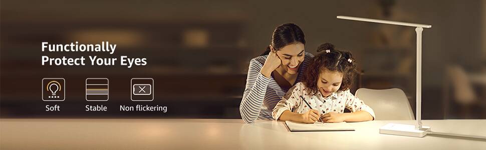 Eye Care Diffused Non-Flickering Lighting: With frosted shade and a long lamp head, this desk lamp allows for more even light and reduces glares, halos, and shadows to protect the eyes and prevent eyestrain.