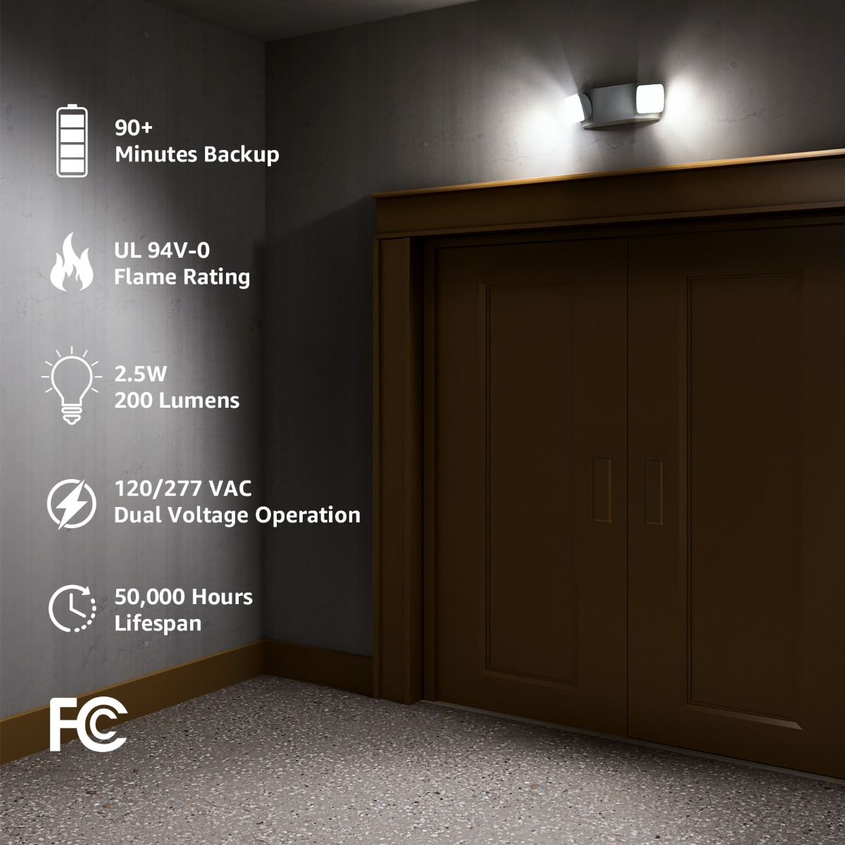 US Standard: The dual-head LED emergency light has an ABS shell made of injection-molded thermoplastic that is also flame retardant (UL 94V-0). This ensures it will still work if there in the case of a fire or an earthquake.