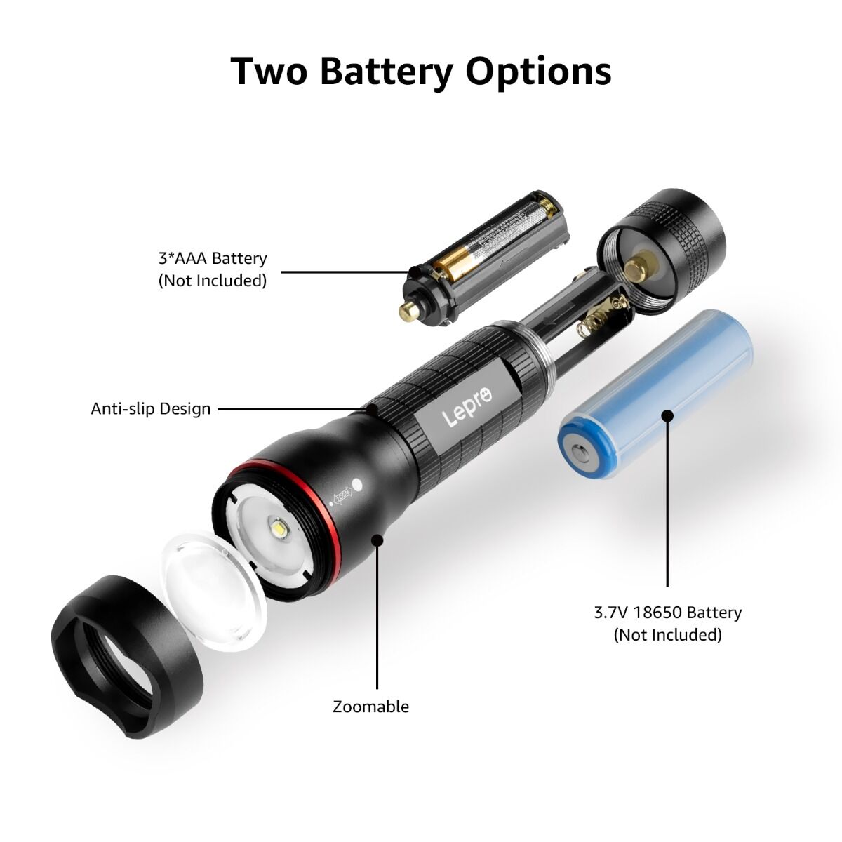 - Battery Options: LED torch can be powered by 18650 or 3Pcs AAA battery. It comes with battery holders and an 18650 battery tube.