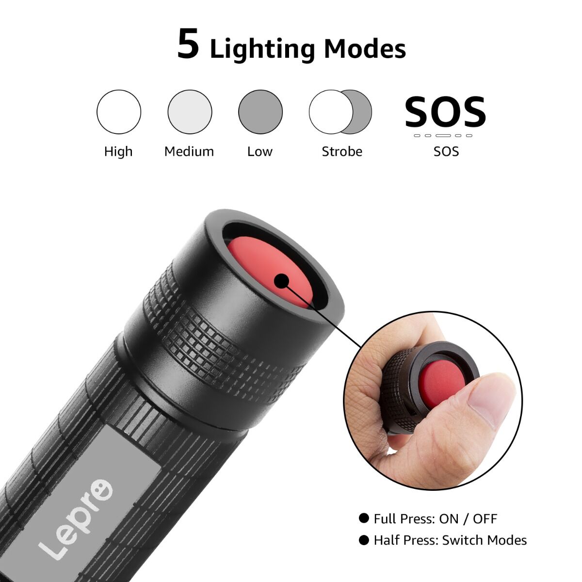 - 5 Lighting Modes: There are five lighting modes options; High, Medium, Low, SOS, and Flash modes. Match all kinds of needs, such as general household use, outdoor activity, power cut, emergency, and search.