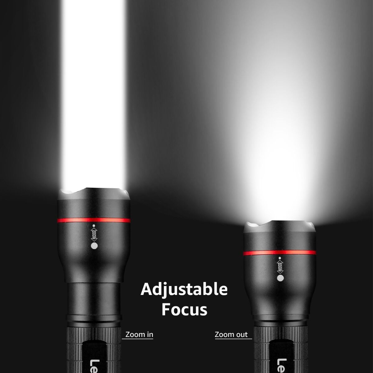 - Adjustable Focus: Zoomable functions make the torch not only light up a bright large area nearby your side but also see a long distance away from your side.